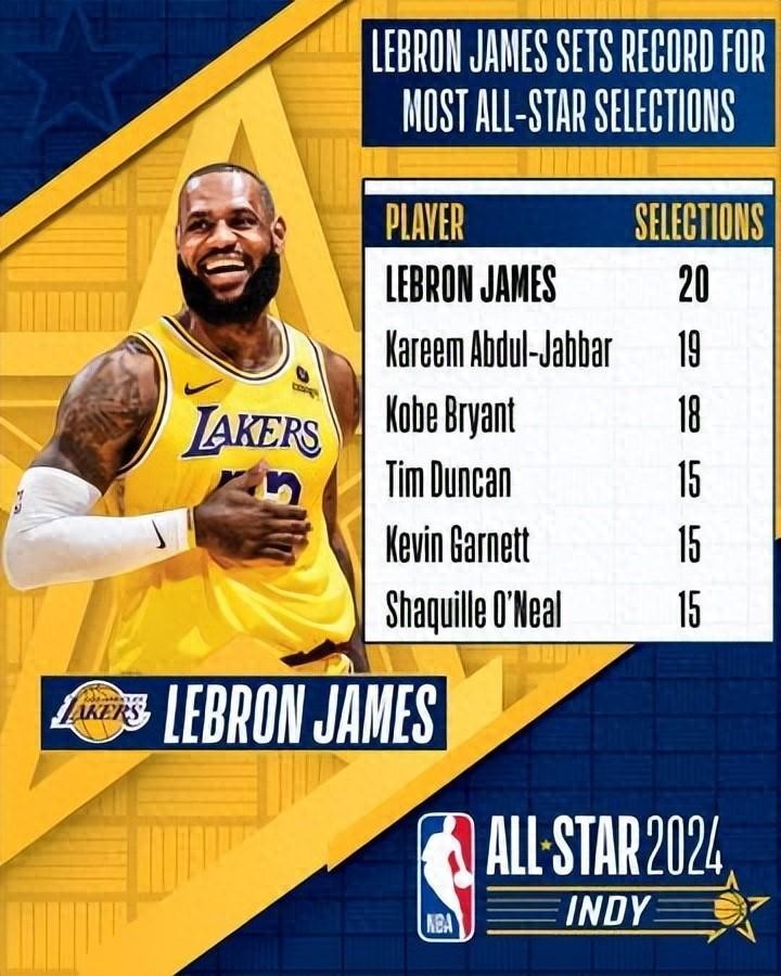 NBA官方宣布了2024年印第安纳全明星正赛的首发阵容,湖人前锋勒布朗-詹姆斯入选西部首发。这是詹姆斯生涯第20次入选全明星,他超越湖人名宿卡里姆-阿卜杜勒-贾巴尔(19次),成为历史上入选全明星次数最多的球员。