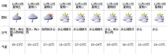 20-21日天气阴凉:20-21日阴天间多云,有分散小雨和轻雾,沿海、高地和海区阵风6-7级,20日气温15-21℃;22日转多云,23-25日可见阳光,气温回升。森林火险红色预警信号降级为黄色,请继续做好防火工作。