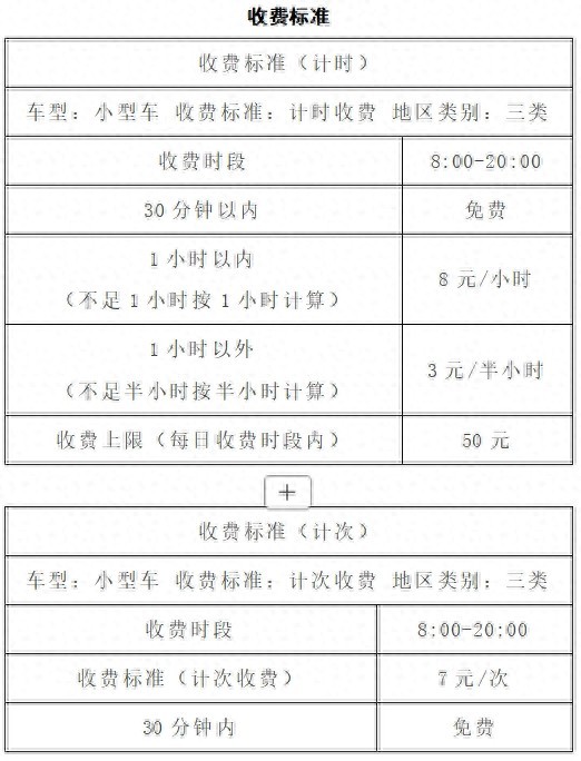 此次停车收费分为计时收费和计次收费两种方式,收费时段为每天8:00至20:00,首停30分钟内免费,道路停车泊位仅供小型客车停放。1小时内收费8元,超过1小时后,不足半小时按半小时计算,每半小时收费3元,每日收费上限为50元。计次收费则为7元/次,同样首停30分钟内免费。