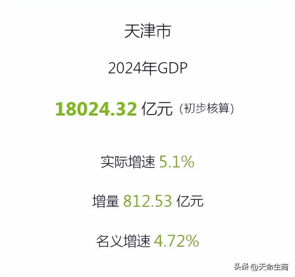 2024年天津市实现地区生产总值为18024.32亿元,比上年增长5.1%。相对上年GDP最终核算,名义增速4.72%。