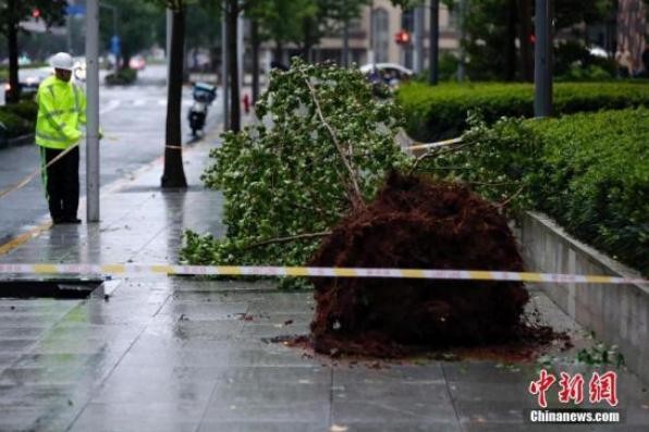 8月10日,街头的一棵行道树被台风“利奇马”连根拔起。中新社记者汤彦俊摄