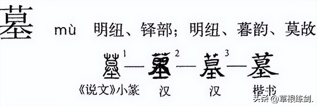 “墓”字的草字头,表示墓穴和夕阳隐没在荒野的草丛中,寓意死者进入地下的黑暗世界。