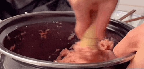 顺时针搅拌,大概搅拌5分钟左右。肉馅开始“起筋”,变得有点拉丝状。这一步是让丸子有弹性的关键。