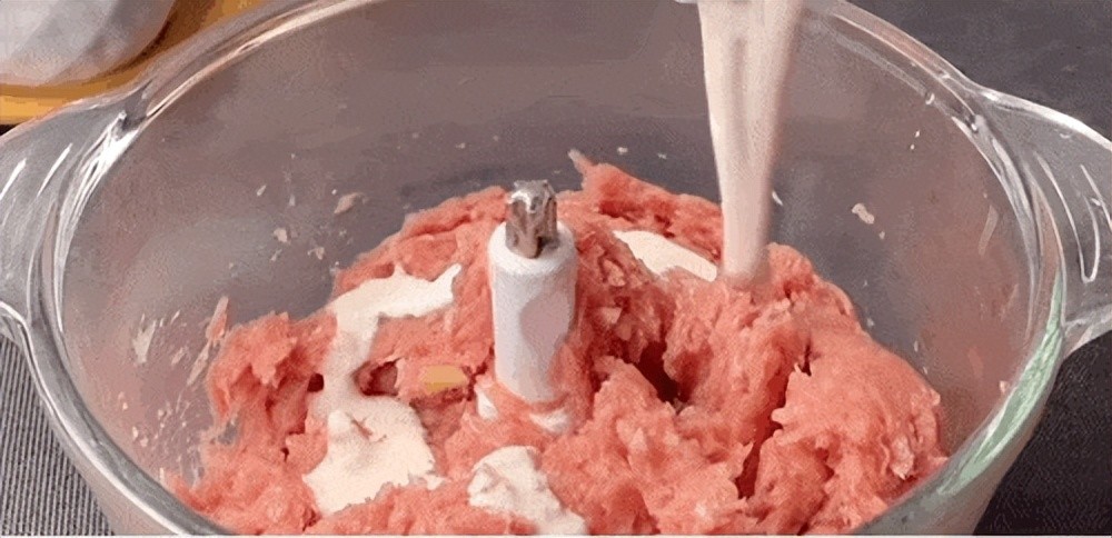 加入盐、鸡精调味,搅打一次。接着再加入刚才调好的木薯粉,倒入绞肉机中,继续搅打。