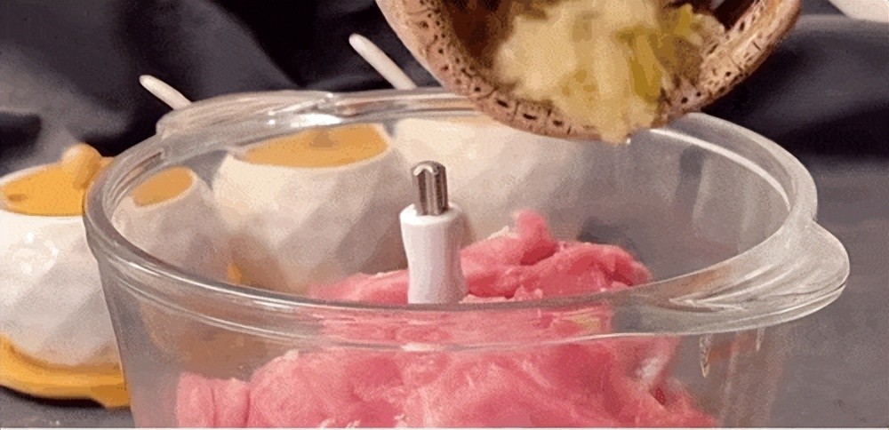 把蒜末、姜末、4块冰块一起放进绞肉机里了,然后开始绞打。一般30秒左右,肉就会被打成肉末。