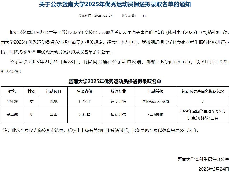 全红婵、吴嘉诚,拟保送暨南大学—上观新闻